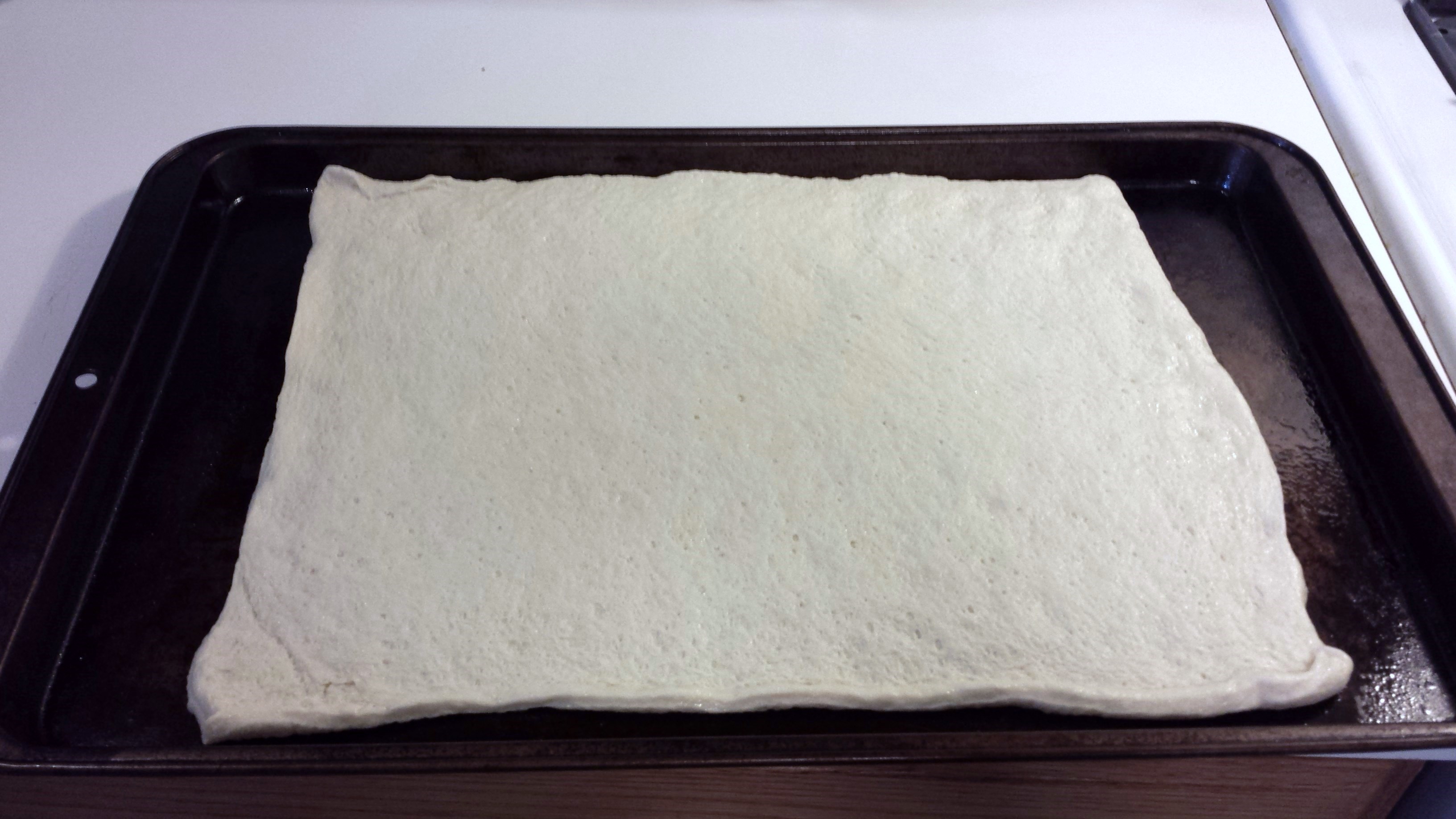 After spraying the baking sheet with non-stick spray – I used butter flavored – I laid out the pre-made pizza crust.
