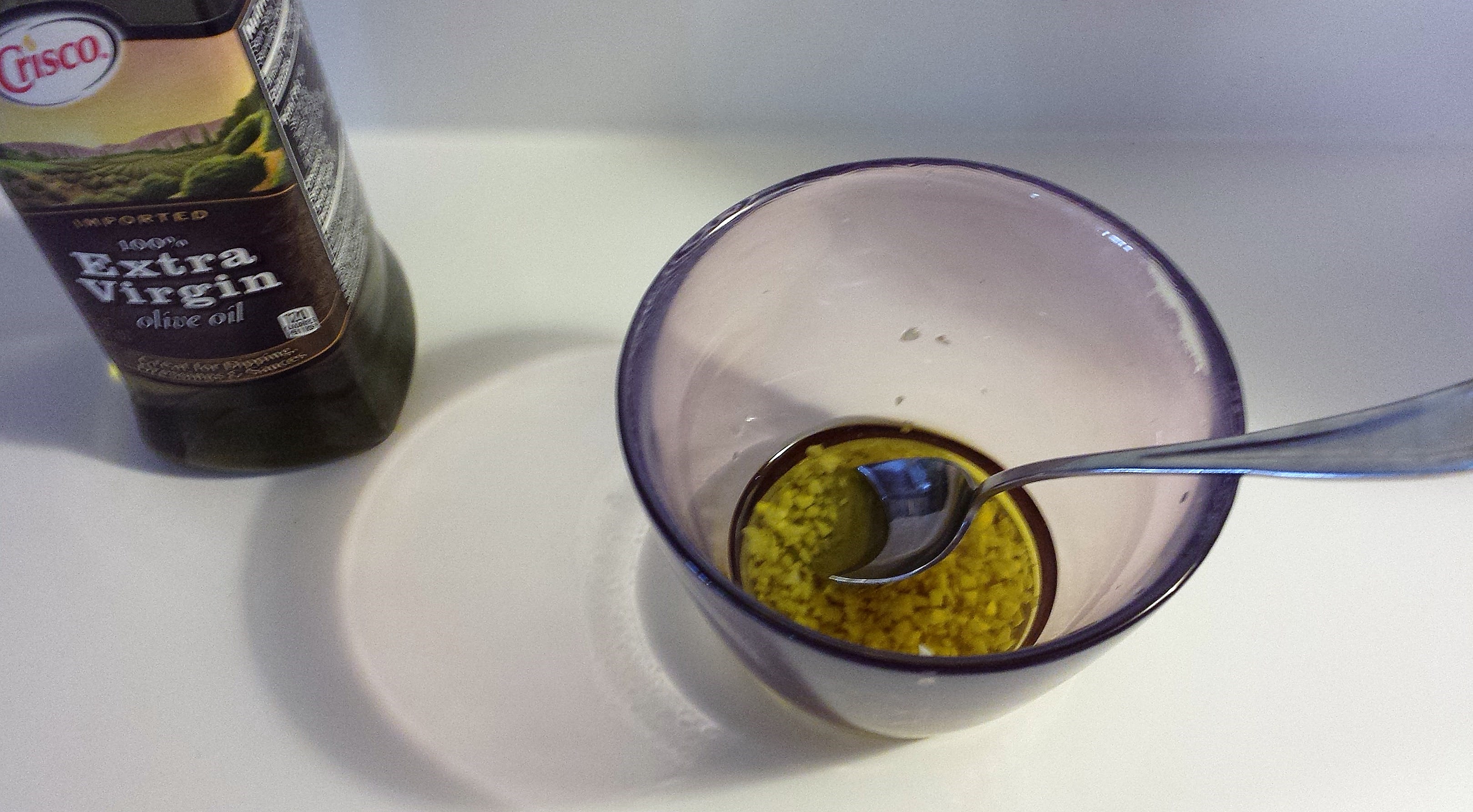 I minced the garlic and then let it bask in the goodness of olive oil for a while. Then I poured the oil and garlic on top of the pizza crust and used my fingers to spread it around so each part of the crust had a thin layer of olive oil.