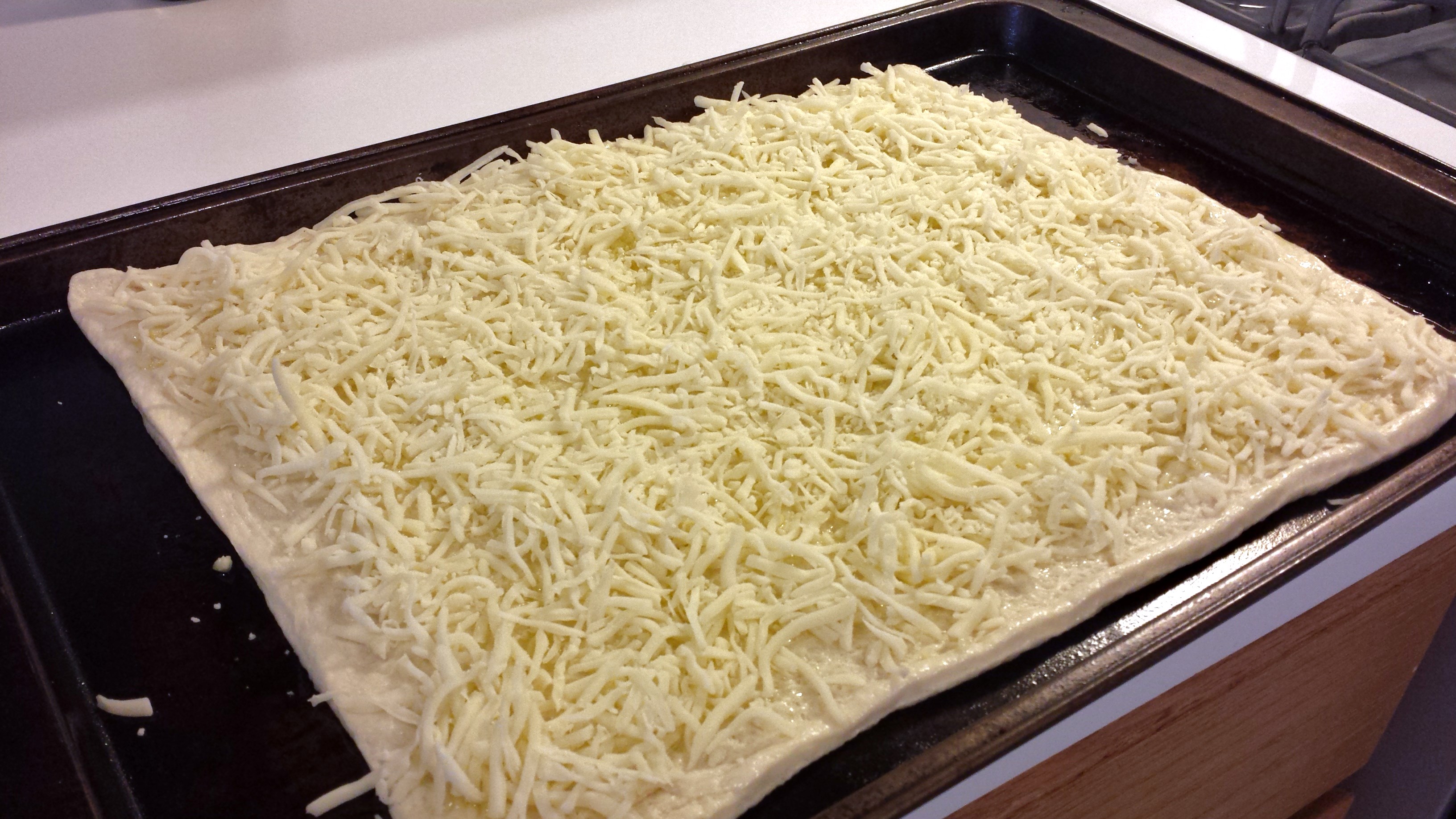 I spread the mozzarella across the crust trying to get cheese just as close to the edge while still leaving a little bare crust to hold onto.